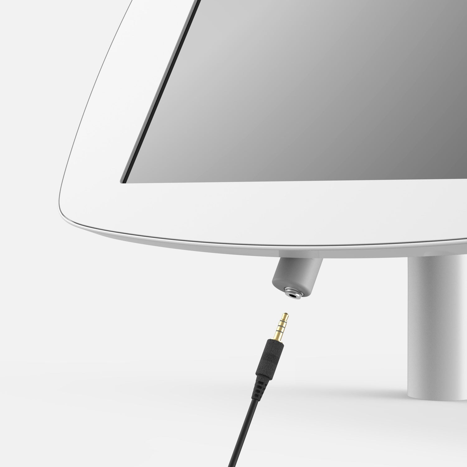 Willst du deinen Kunden ein vielseitigeres Erlebnis bieten? Schließe Kopfhörer oder Lautsprecher an, indem du dein Bouncepad so konfigurierst, dass es Zugriff auf den Audio Anschluss deines Tablets hat. Es verwendet ein verdecktes 3,5-mm-TRRS-4-Pol-Audioklinken-Verlängerungskabel, das mit Kopfhörern und Lautsprechern mit Inline-Steuerung und Mikrofonen verwendet werden kann. Bitte wähle aus den kompatiblen Tablets im Dropdown-Menü oben.