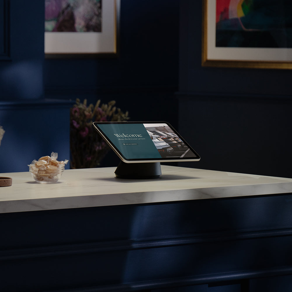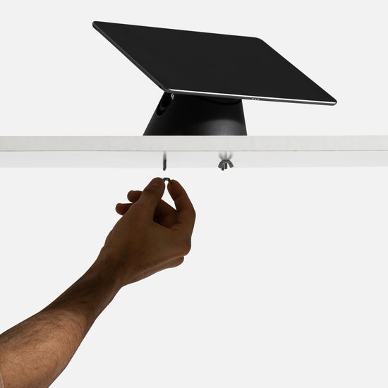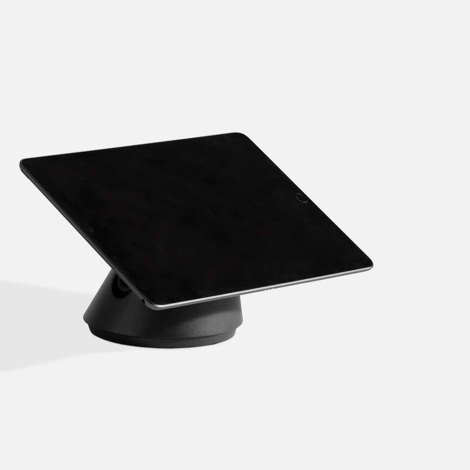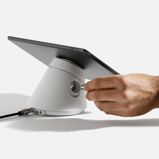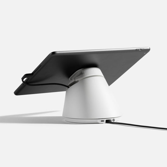 Click eignet sich perfekt für den Point of Sale (POS) oder den Verkaufsraum. Er lässt sich elegant auf dem Tresen, dem Tisch oder an der Wand platzieren und verwaltet die Kabel, auch wenn das Tablet abgedockt ist. Dank des drehbaren Standfußes kannst du den Bildschirm auch mit deinen Kunden teilen.