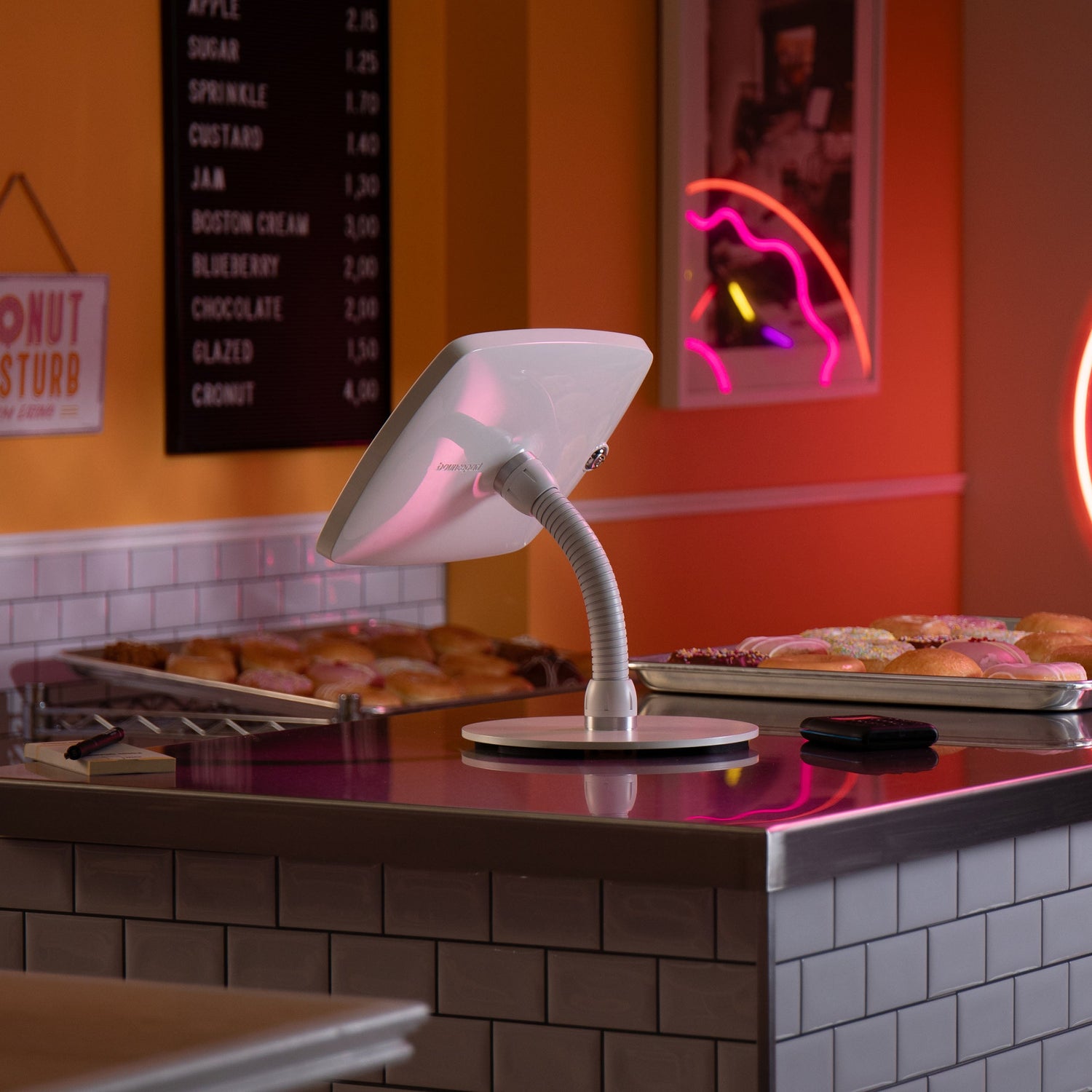 Der Bouncepad Original Counter Flex ist ein sicherer, freistehender iPad und Tablet Ständer, der ergonomisch für eine einfache Interaktion gestaltet ist, wenn er auf einer Theke, einem Tisch oder einem Schreibtisch platziert wird. Der verstellbare Schwanenhals bietet einen großen Bewegungsbereich, sodass er im perfekten Winkel für die Interaktion mit dem Benutzer positioniert werden kann.