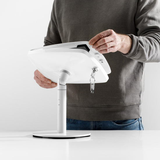 The Original Counter Twist is a secure, ergonomic tablet and iPad stand with a freestanding base for low-level counters in customer-facing spaces.