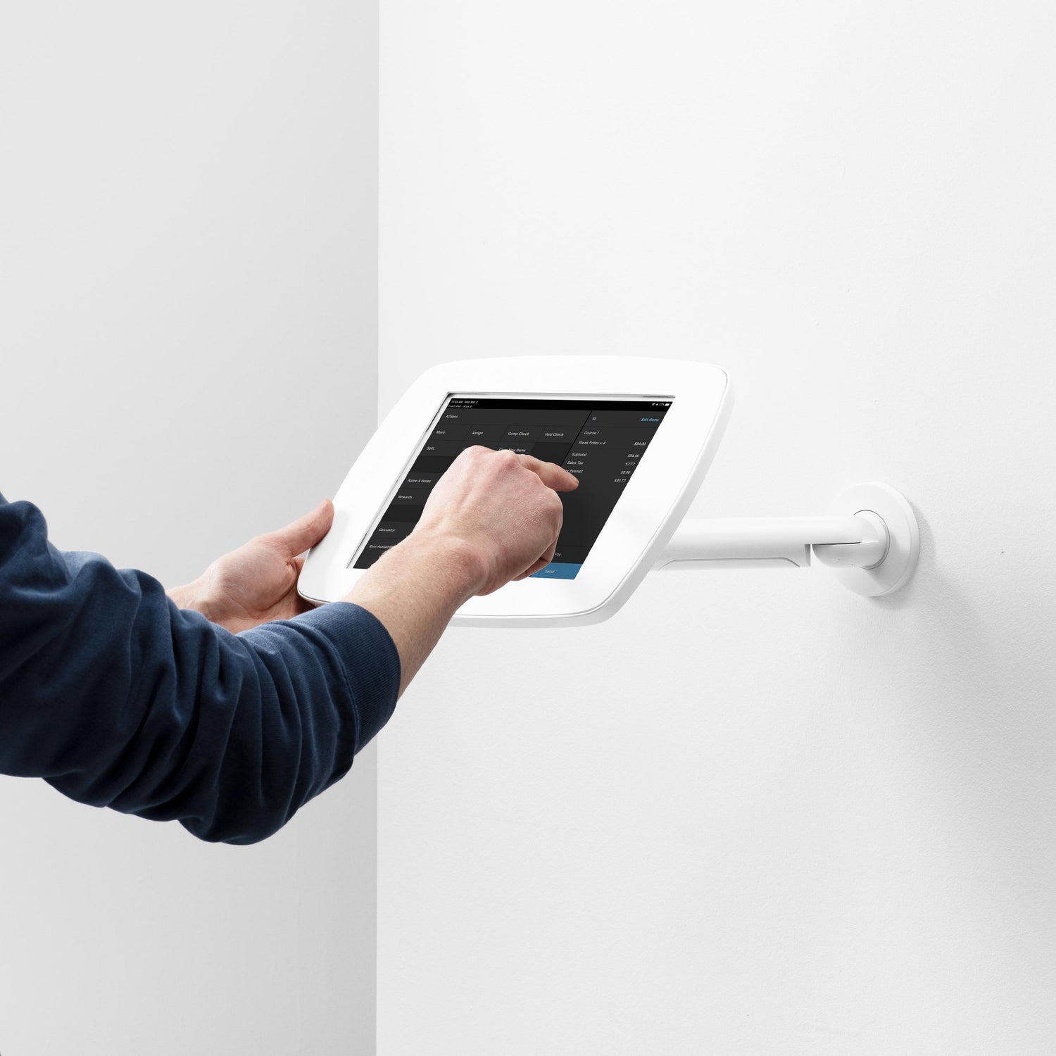 The adjustable arm lets you easily pan, tilt, and extend the tablet to meet user needs, making it easy to interact, no matter the height or angle. When you're done, simply fold it neatly back against the wall to save space.