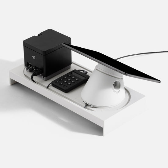 Caddy is Click's little helper, managing peripheral devices like card readers and receipt printers, keeping their power cables tidy and concealed. It’s the perfect Tablet and iPad stand setup for retail and hospitality.