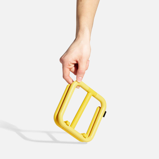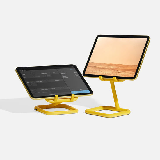With its 50/50 diecast aluminium and rubber construction, Go is sleek and sturdy whilst protecting your tablet and worktops. The dual hinge mechanism means adjusting the height and angle is a breeze. Available in four colours, add a splash of colour with Go in blue and yellow, or keep it minimal with white or black.